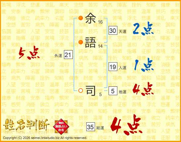 生活面を象徴する運勢です。外部から受ける影響力を表し、結婚運、家庭運や職場、環境への順応性を表します。総運から人運を引いた画数。姓や名が1文字の場合を除く。