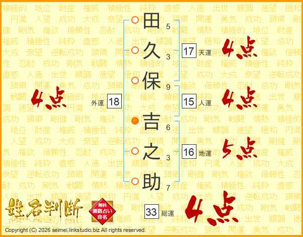 田(5画)久(3画)保(9画) 吉(6画)之(3画)助(7画)