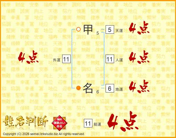 あなたの人生を表す1番重要な運勢です。生涯を通じて影響する総合運となり、主に50歳以降の晩年期に影響を及ぼします。苗字と名前の合計画数。