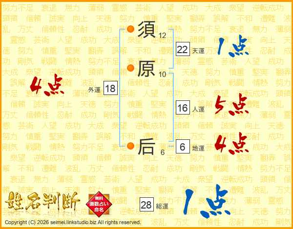 生活面を象徴する運勢です。外部から受ける影響力を表し、結婚運、家庭運や職場、環境への順応性を表します。総運から人運を引いた画数。姓や名が1文字の場合を除く。