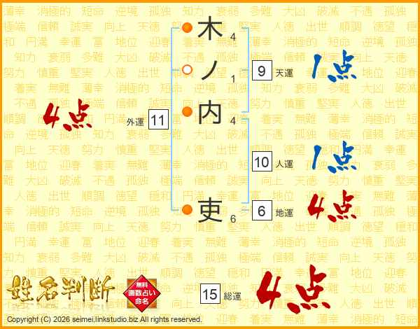 木(4画)ノ(1画)内(4画) 吏(6画)