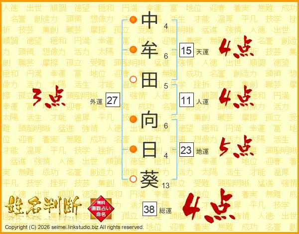 中(4画)牟(6画)田(5画) 向(6画)日(4画)葵(13画)