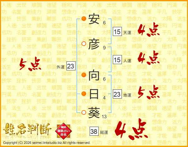 安(6画)彦(9画) 向(6画)日(4画)葵(13画)
