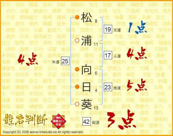 松(8画)浦(11画) 向(6画)日(4画)葵(13画)