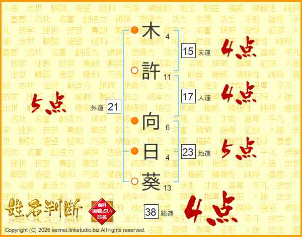 木(4画)許(11画) 向(6画)日(4画)葵(13画)