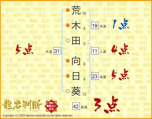 荒(10画)木(4画)田(5画) 向(6画)日(4画)葵(13画)