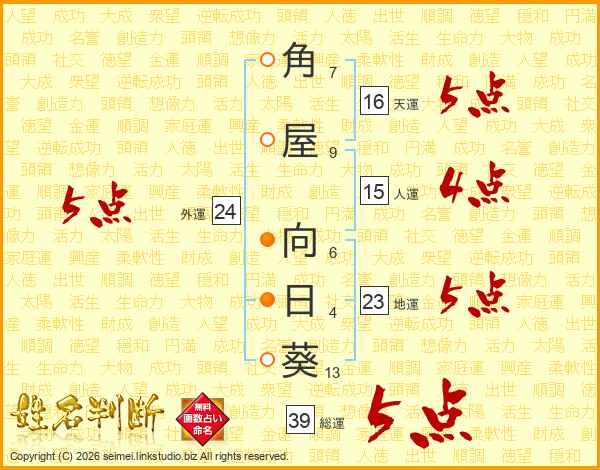 角(7画)屋(9画) 向(6画)日(4画)葵(13画)