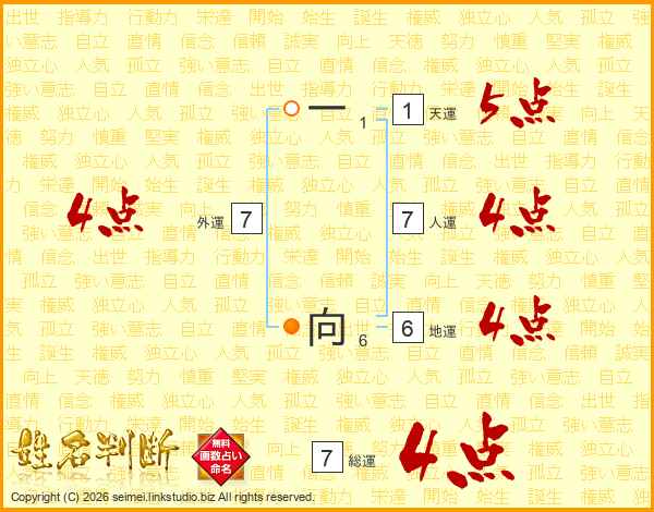 生活面を象徴する運勢です。外部から受ける影響力を表し、結婚運、家庭運や職場、環境への順応性を表します。総運から人運を引いた画数。姓や名が1文字の場合を除く。