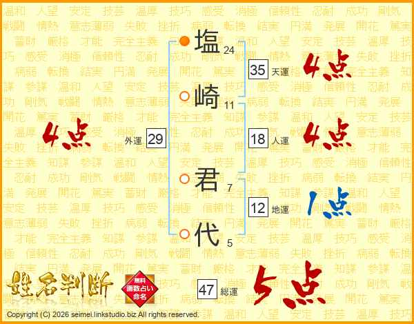 塩(24画)崎(11画) 君(7画)代(5画)