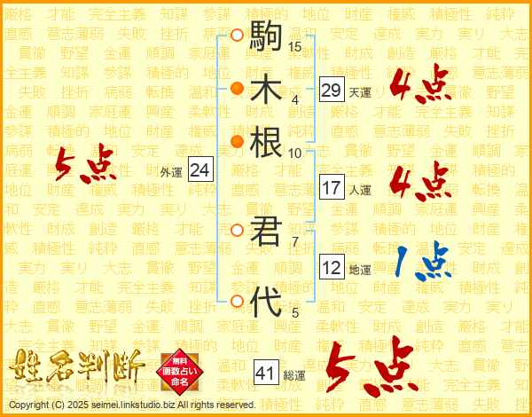 駒(15画)木(4画)根(10画) 君(7画)代(5画)