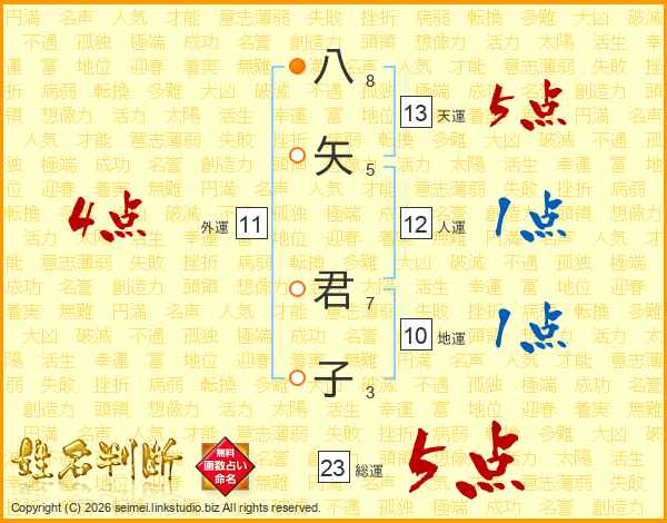 家系が持つ宿命的な運勢を表します。祖先から受け継いだ苗字ですので自分の力が及びません。家柄を象徴します。苗字の合計画数。