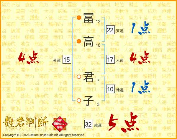 あなたの人生を表す1番重要な運勢です。生涯を通じて影響する総合運となり、主に50歳以降の晩年期に影響を及ぼします。苗字と名前の合計画数。