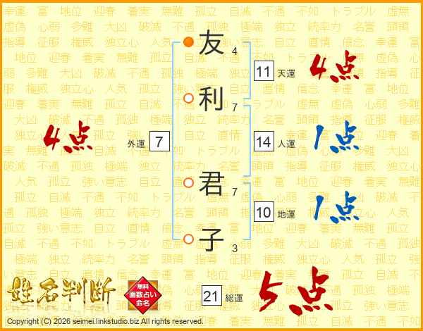友(4画)利(7画) 君(7画)子(3画)