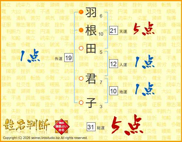 羽根田君子さんの天運は21画の5点!