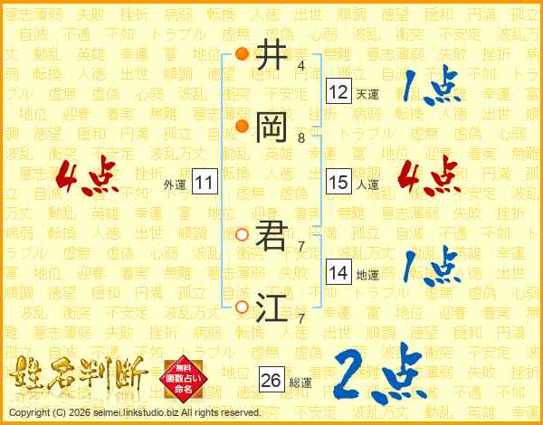 あなたの人生を表す1番重要な運勢です。生涯を通じて影響する総合運となり、主に50歳以降の晩年期に影響を及ぼします。苗字と名前の合計画数。