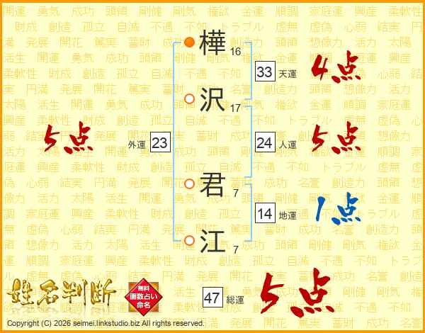 樺沢君江さんの総運は47画の5点!