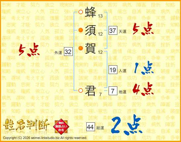 蜂(13画)須(12画)賀(12画) 君(7画)