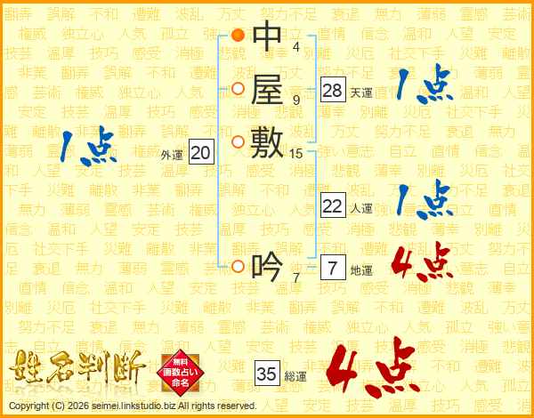中(4画)屋(9画)敷(15画) 吟(7画)
