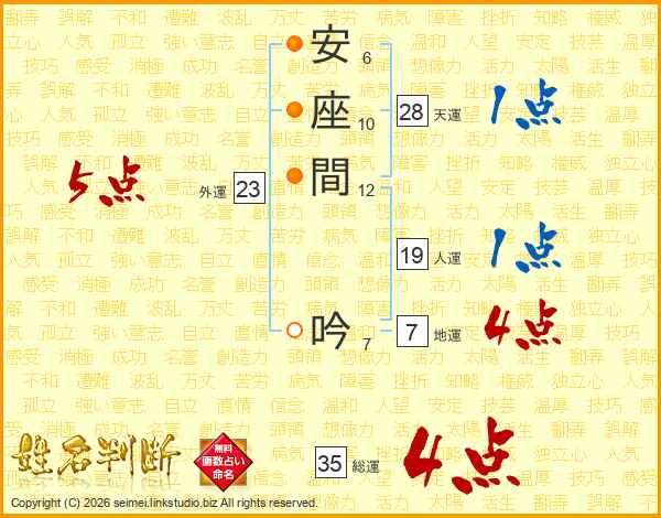 生活面を象徴する運勢です。外部から受ける影響力を表し、結婚運、家庭運や職場、環境への順応性を表します。総運から人運を引いた画数。姓や名が1文字の場合を除く。