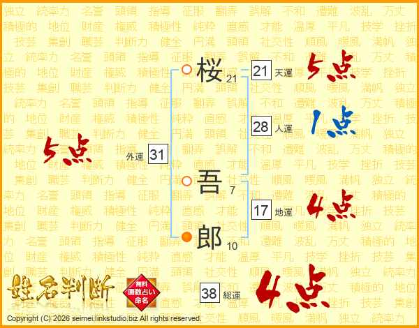 桜(21画) 吾(7画)郎(10画)