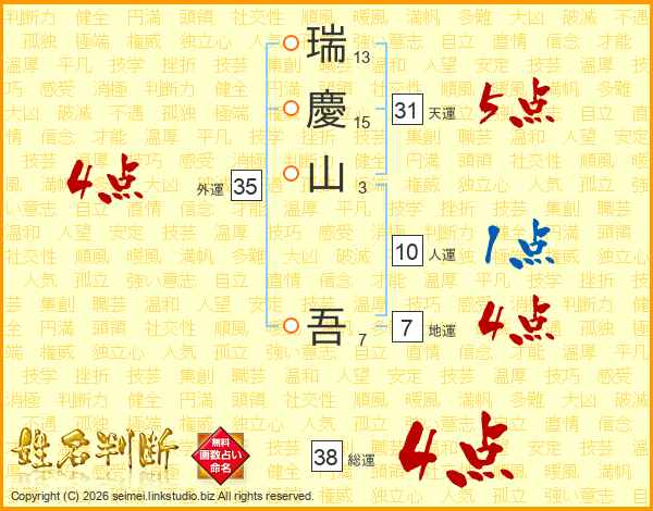 瑞(13画)慶(15画)山(3画) 吾(7画)
