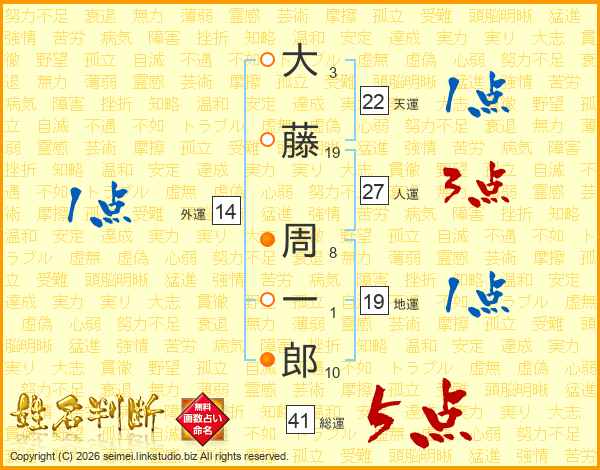 大(3画)藤(19画) 周(8画)一(1画)郎(10画)