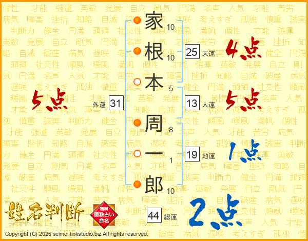 家(10画)根(10画)本(5画) 周(8画)一(1画)郎(10画)
