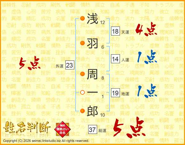 浅(12画)羽(6画) 周(8画)一(1画)郎(10画)