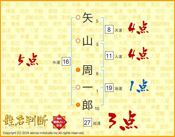 矢(5画)山(3画) 周(8画)一(1画)郎(10画)