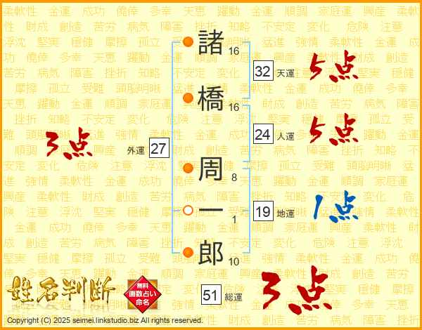 諸(16画)橋(16画) 周(8画)一(1画)郎(10画)