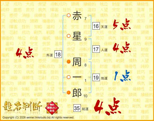 赤(7画)星(9画) 周(8画)一(1画)郎(10画)
