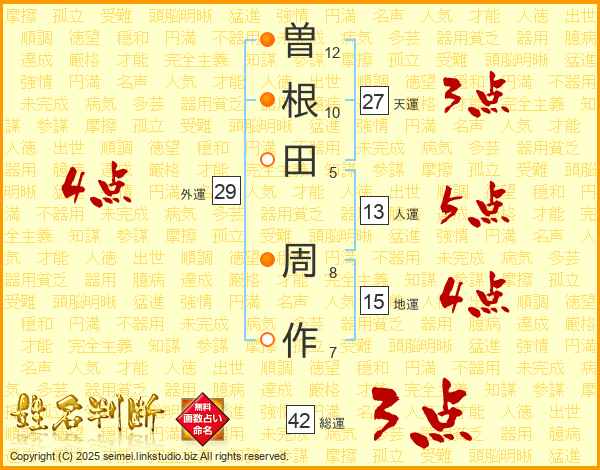 曽(12画)根(10画)田(5画) 周(8画)作(7画)