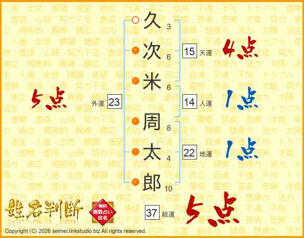 久(3画)次(6画)米(6画) 周(8画)太(4画)郎(10画)