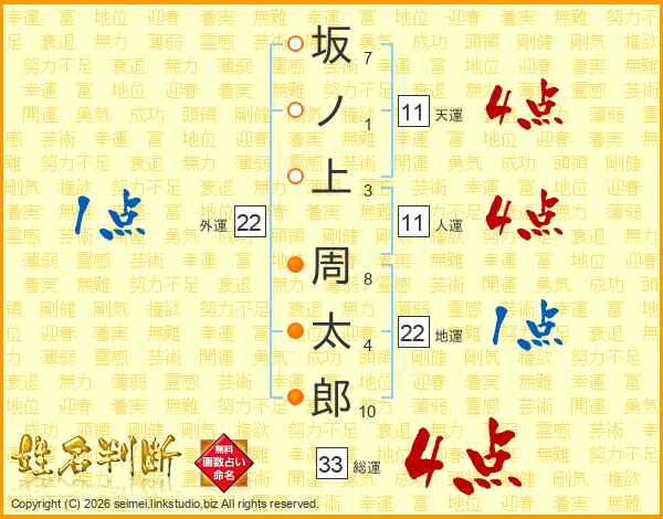 坂(7画)ノ(1画)上(3画) 周(8画)太(4画)郎(10画)