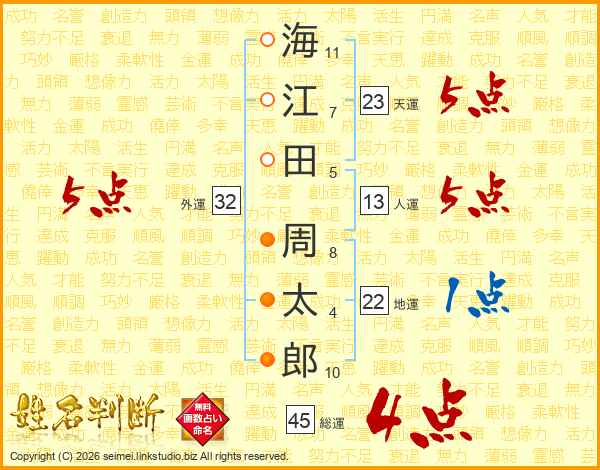 海(11画)江(7画)田(5画) 周(8画)太(4画)郎(10画)