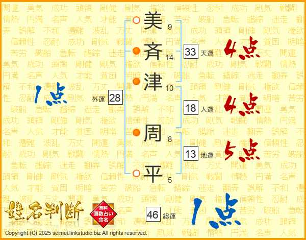 美(9画)斉(14画)津(10画) 周(8画)平(5画)