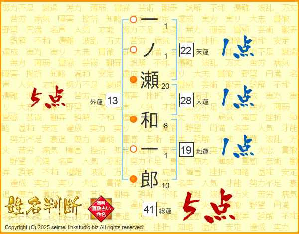 一(1画)ノ(1画)瀬(20画) 和(8画)一(1画)郎(10画)