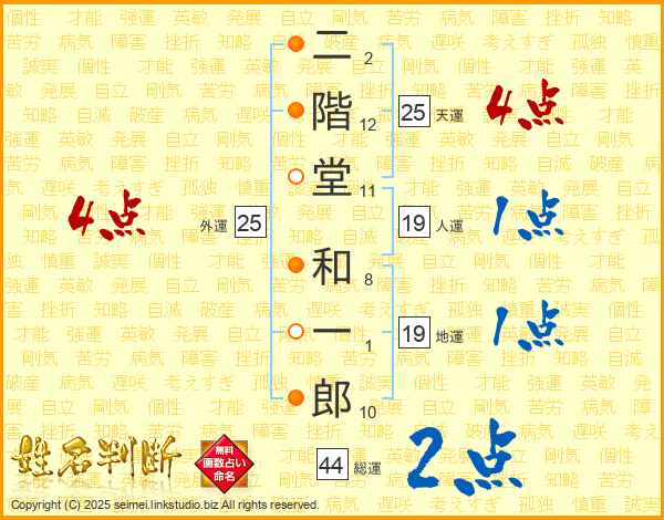 二(2画)階(12画)堂(11画) 和(8画)一(1画)郎(10画)