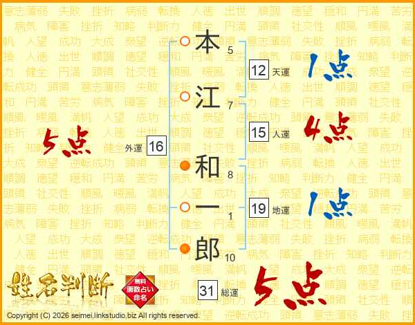 本(5画)江(7画) 和(8画)一(1画)郎(10画)