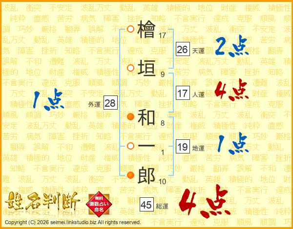 檜(17画)垣(9画) 和(8画)一(1画)郎(10画)