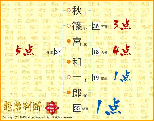 秋(9画)篠(17画)宮(10画) 和(8画)一(1画)郎(10画)