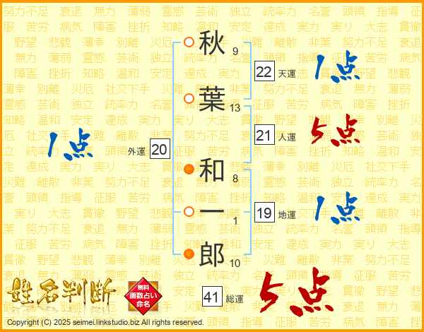 秋(9画)葉(13画) 和(8画)一(1画)郎(10画)
