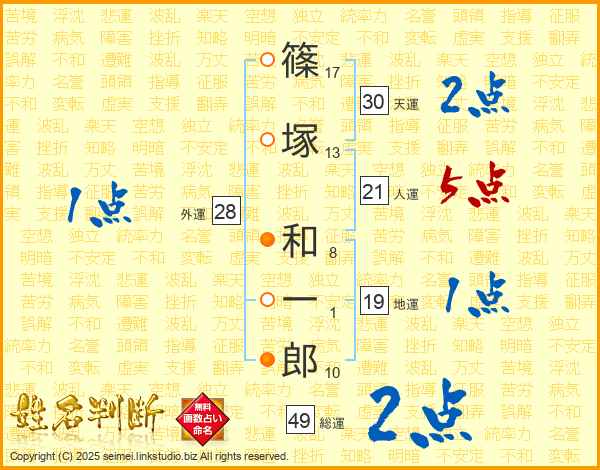 篠(17画)塚(13画) 和(8画)一(1画)郎(10画)