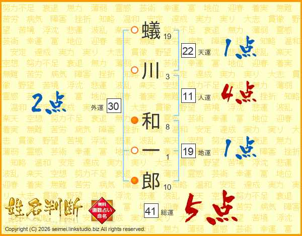 蟻(19画)川(3画) 和(8画)一(1画)郎(10画)