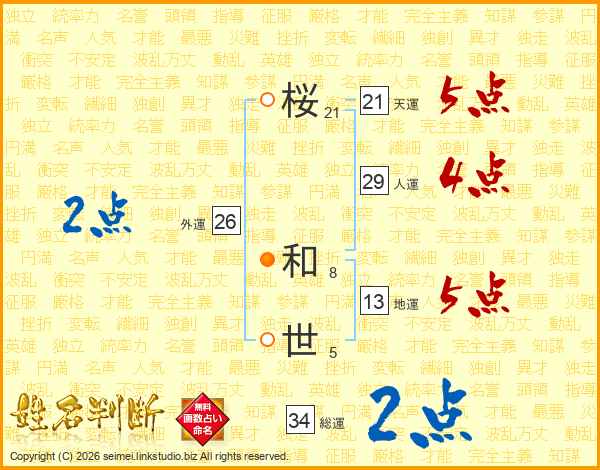 生活面を象徴する運勢です。外部から受ける影響力を表し、結婚運、家庭運や職場、環境への順応性を表します。総運から人運を引いた画数。姓や名が1文字の場合を除く。