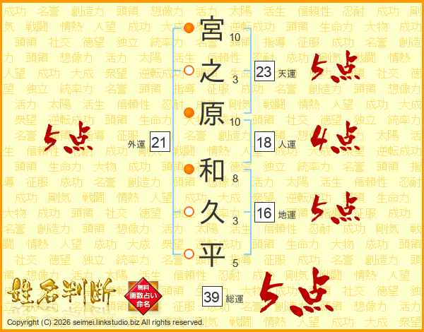 宮(10画)之(3画)原(10画) 和(8画)久(3画)平(5画)