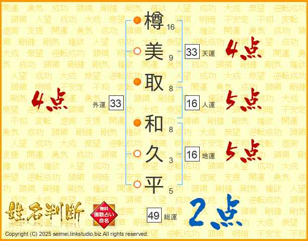 樽(16画)美(9画)取(8画) 和(8画)久(3画)平(5画)