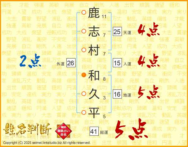 鹿(11画)志(7画)村(7画) 和(8画)久(3画)平(5画)