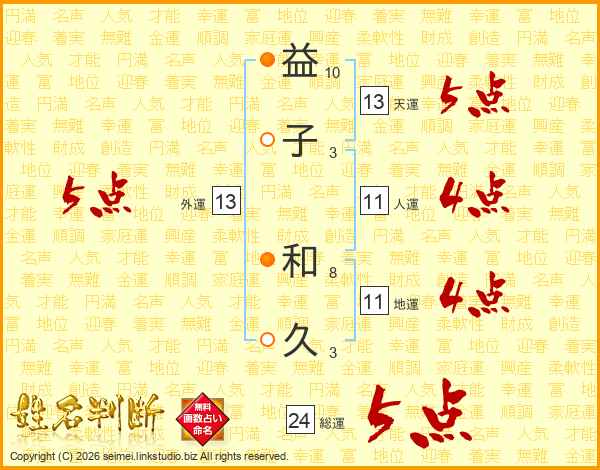 生活面を象徴する運勢です。外部から受ける影響力を表し、結婚運、家庭運や職場、環境への順応性を表します。総運から人運を引いた画数。姓や名が1文字の場合を除く。