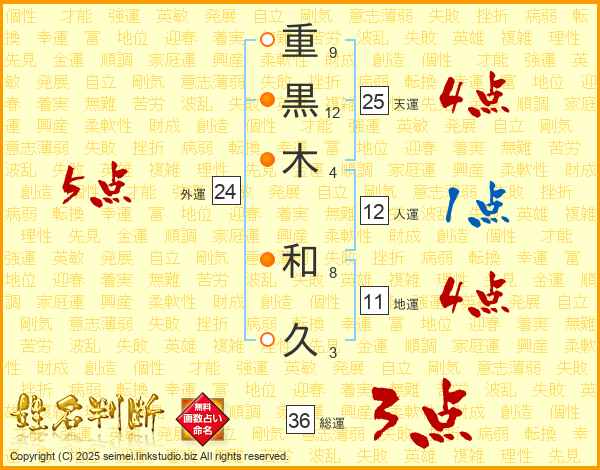 重(9画)黒(12画)木(4画) 和(8画)久(3画)